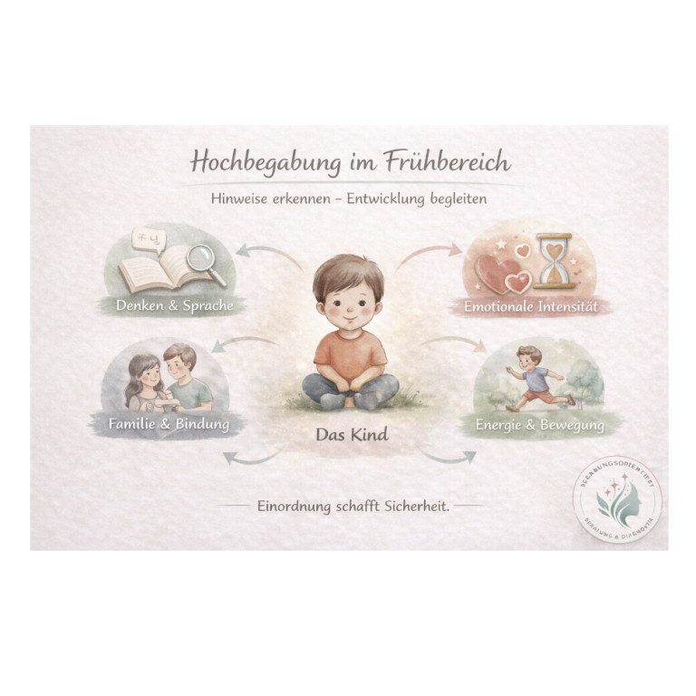 Begabungsforschung beschreibt, dass hohe kognitive Fähigkeiten bereits im Vorschulalter durch Entwicklungsbeschleunigung, außergewöhnliche Gedächtnisleistung oder komplexe Verknüpfungsfähigkeit erkennbar sein können. Gleichzeitig verlaufen kognitive, emotionale und soziale Entwicklung nicht immer synchron. Ein Kind kann sehr weit denken – und dennoch emotional noch kindlich reagieren.